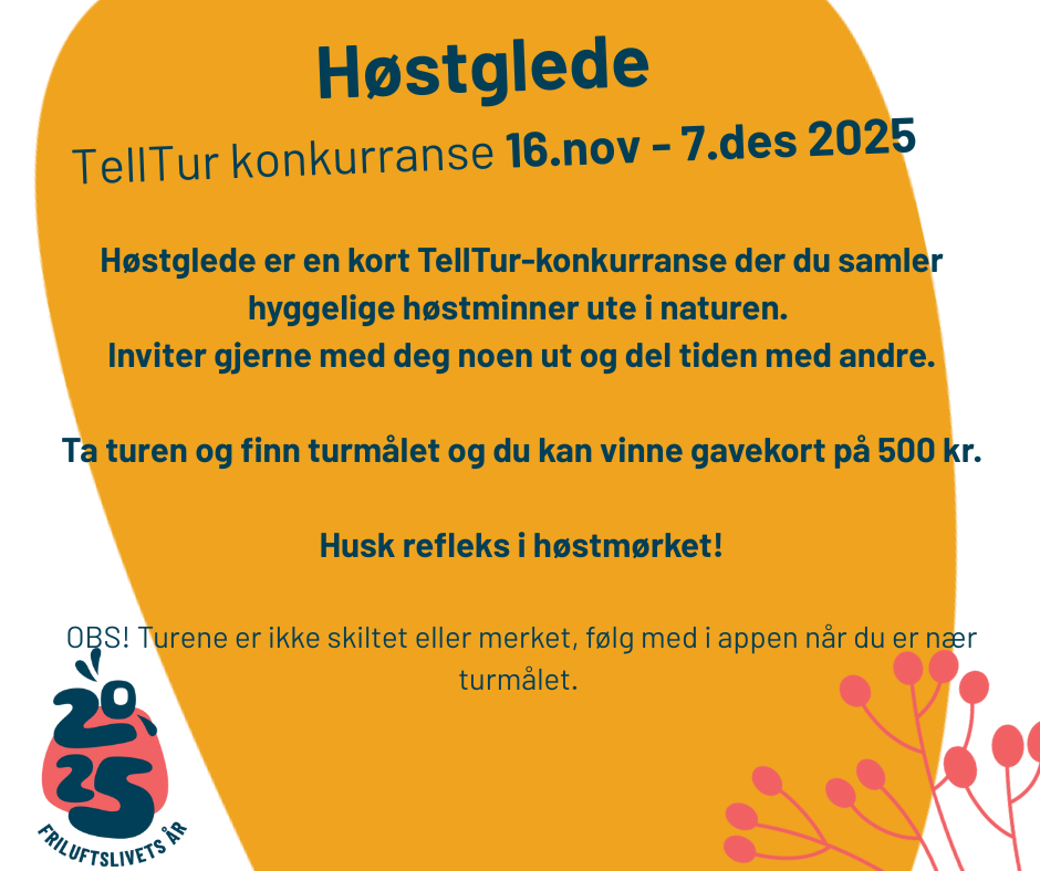 Høstglede - TellTur konkurranse 16.nov-7.des 2025 Her finner du informasjon om turkonkurransene: Telltur Sist endret 21.11.2025 14.36